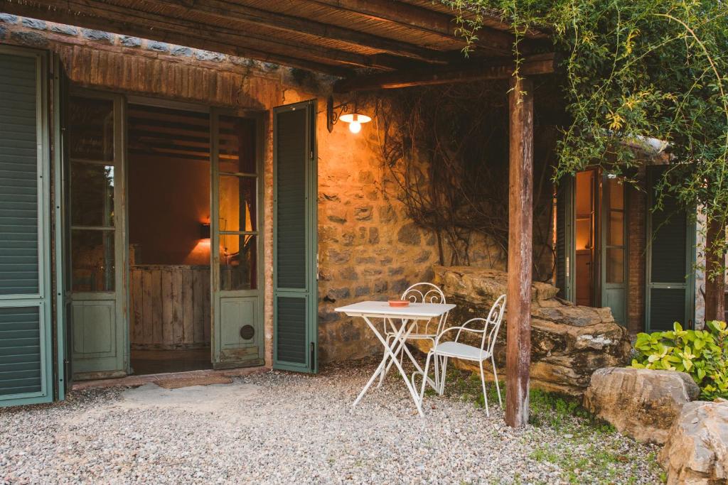 Rooms are simple, with stone walls, warm tones, and countryside views from almost every window.