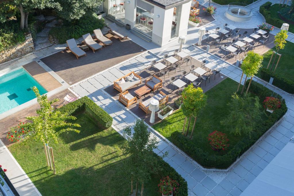 Its outdoor pool is nestled among manicured lawns and terraces, perfect for sunbathing and leisurely swims.